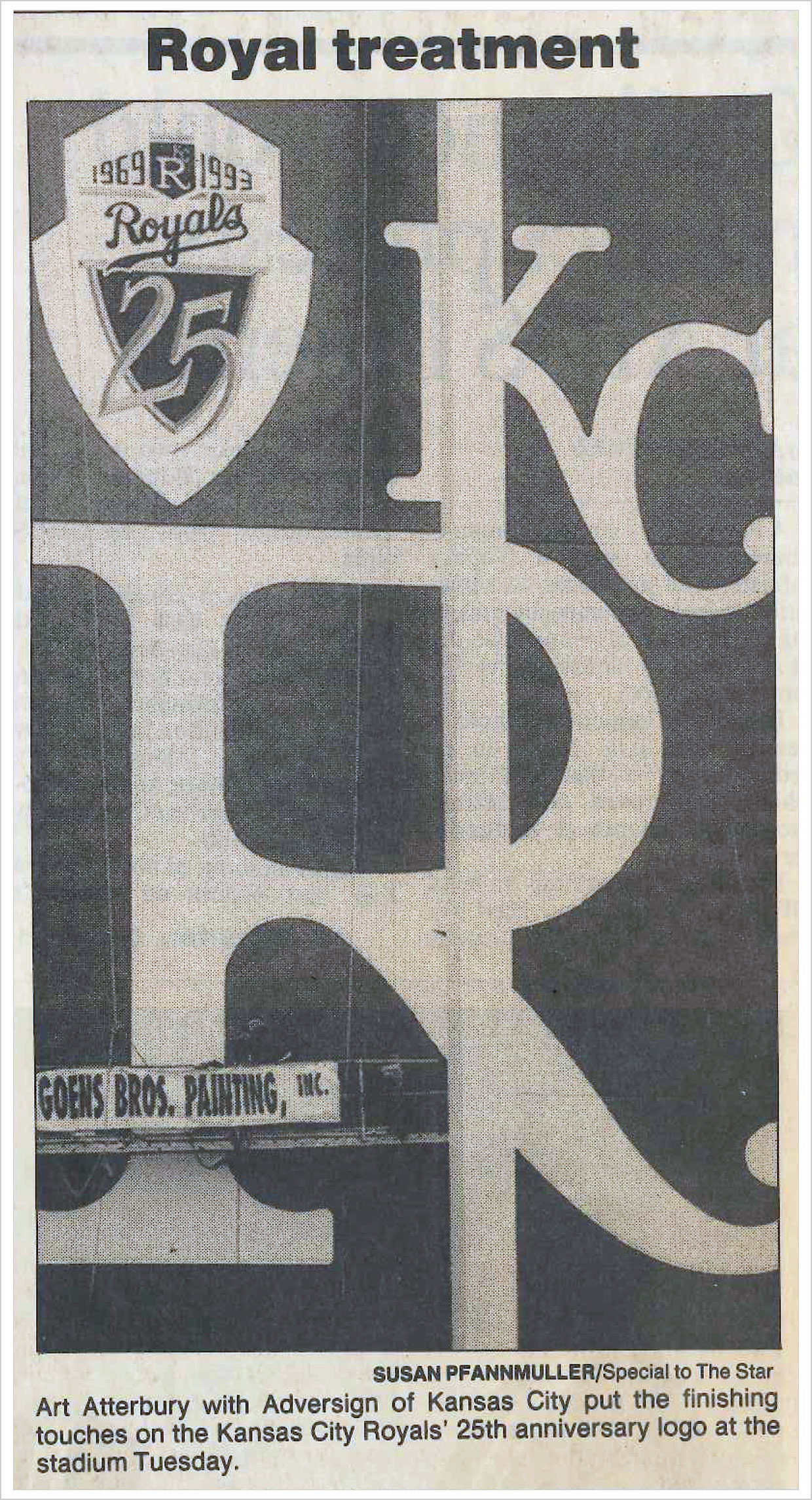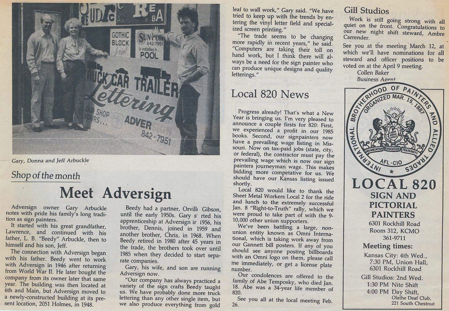 Jeff Arbuckle’s grandfather and owner of Adversign was Lawrence “Beedy” Arbuckle. He had a successful sign business prior to World War II designing and installing signs for Sealtest Ice Cream Soda and all types of commercial vehicles/trucks in the greater Kansas City area. He practiced the lost sign art of “wall lettering”…hand painted lettering still visible on the exterior brick walls of many of Kansas City’s oldest buildings. Beedy was drafted into the Army in 1943 and served on the island of Saipan until the war ended. He came home and began working for “Adversign Sign Company” at 8th & Grand in downtown KC. When the original owner (Robert Fixley) was injured in an auto accident, Beedy partnered with a fellow sign painter and bought the business in 1947. Eventually, Beedy bought out his partner and Adversign built and moved to a new building on Holmes in downtown Kansas City. As his three sons grew older, they would become an important part of the company. By 1968 Beedy Arbuckle and sons, Gary, Denny and Chris, were all partners in Adversign.